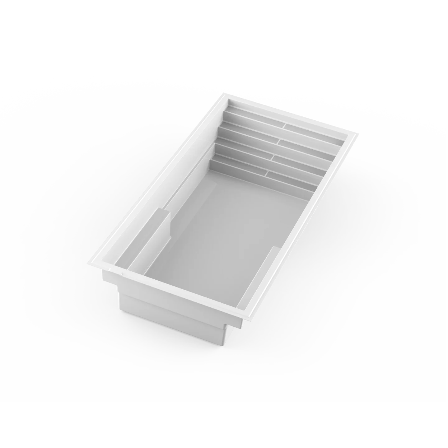 Discover the 13×27 fiberglass in-ground pool, a generous space designed to maximize your swimming experience. Equipped with elegant side benches, it offers both ample space for swimming and comfortable areas for relaxing.